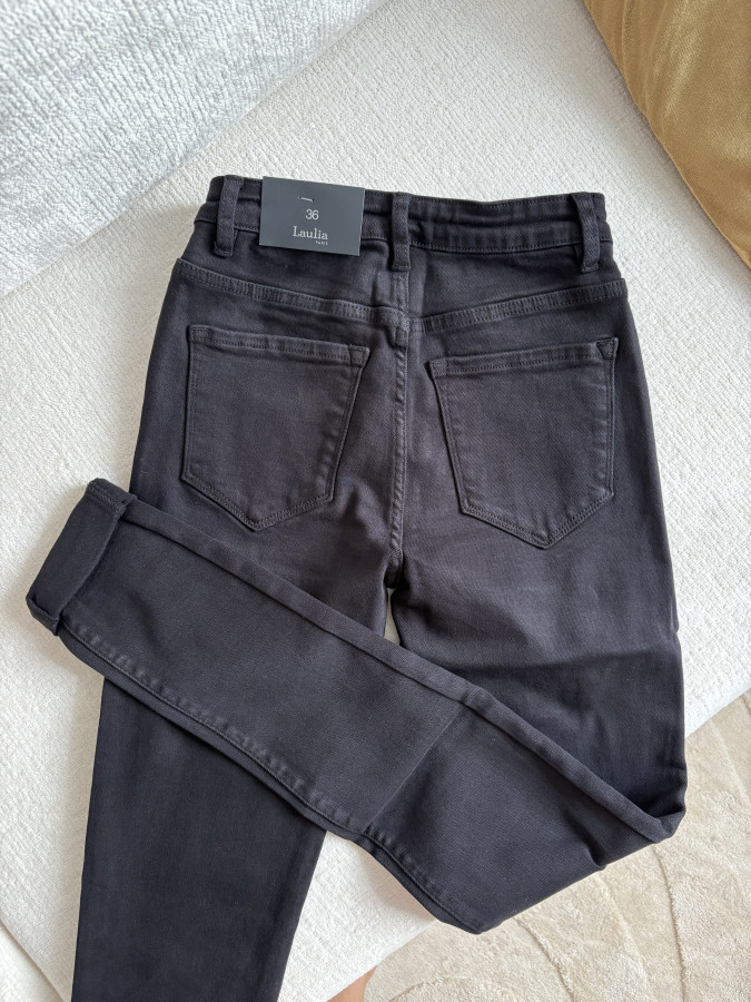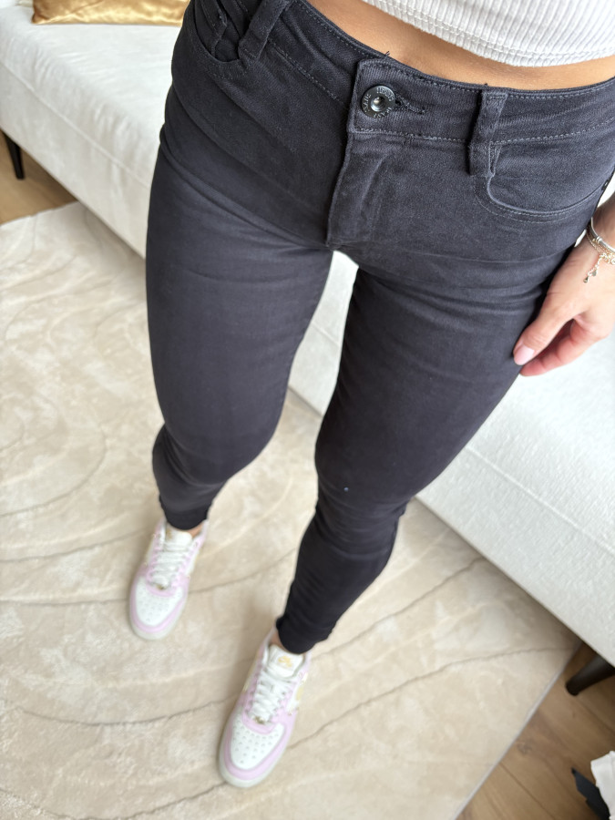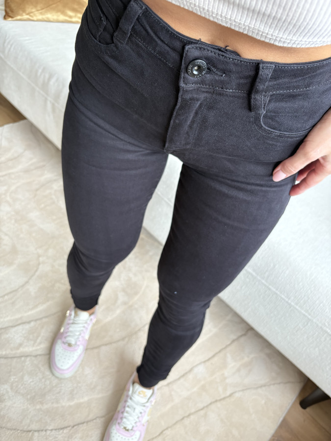 Elastické čierne denim rifle z kvalitnej rifloviny . Sú s vyšším pásom. Na fotke je veľkosť S. Modelka má výšku 170cm.