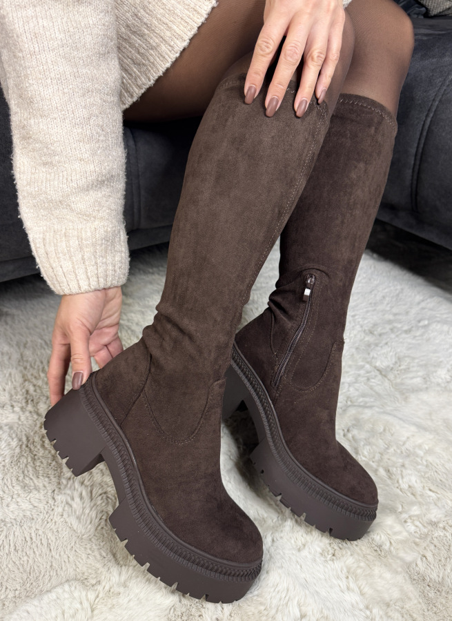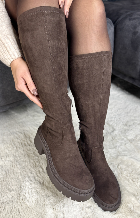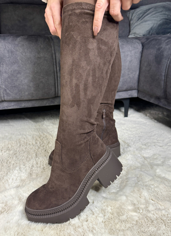 Velmi pekné hnedé, semišové čižmy s vyššou elastickou sárou, ktorá sa prispôsobí káždému lítku, takže sa už nemusíte obávať, či čižmičky zapnete. Táto farba je hit sezóny.