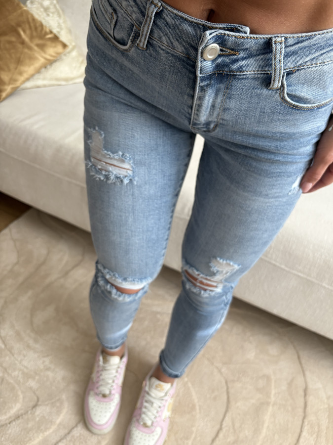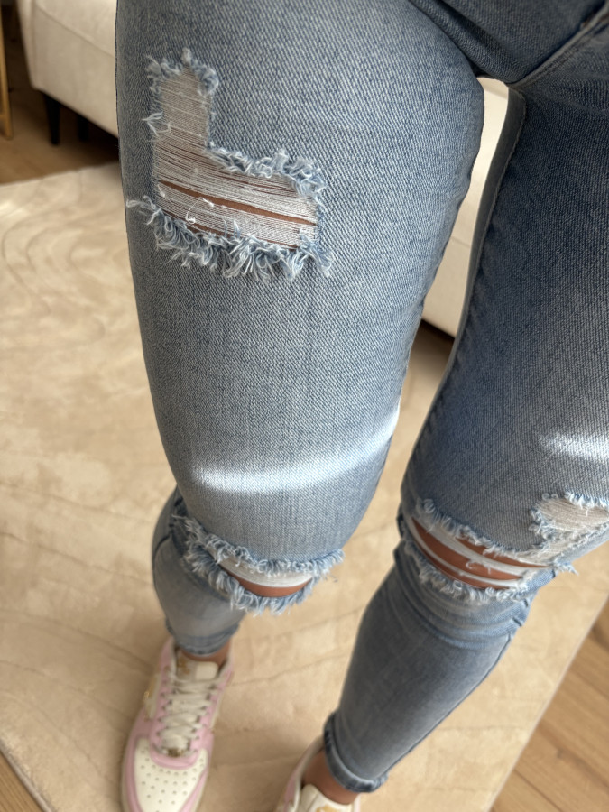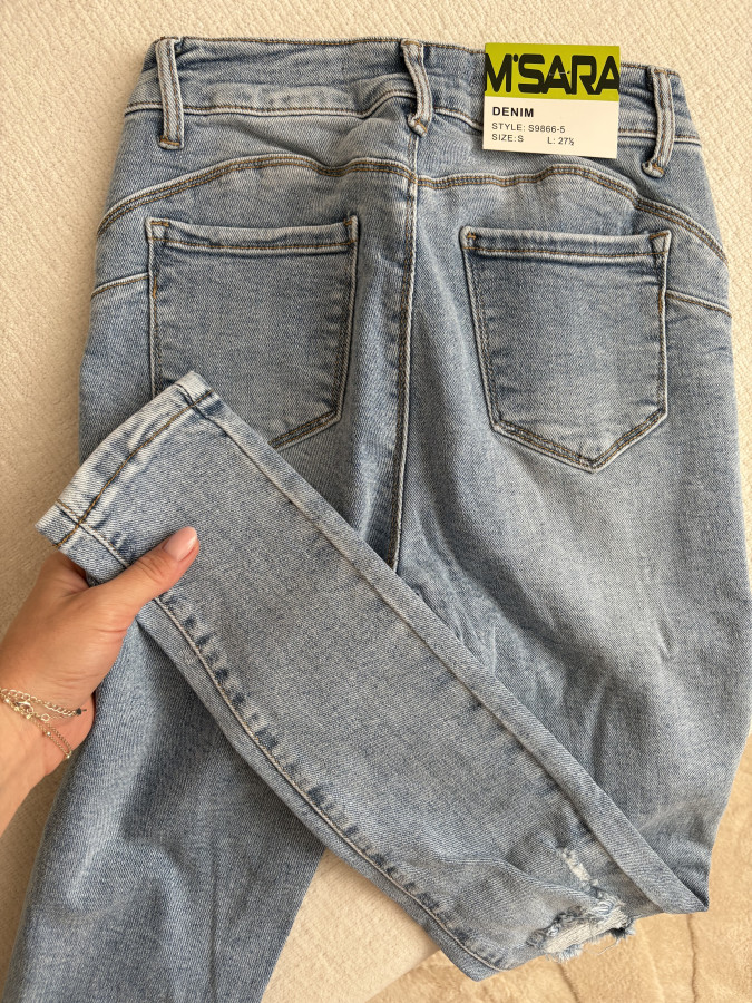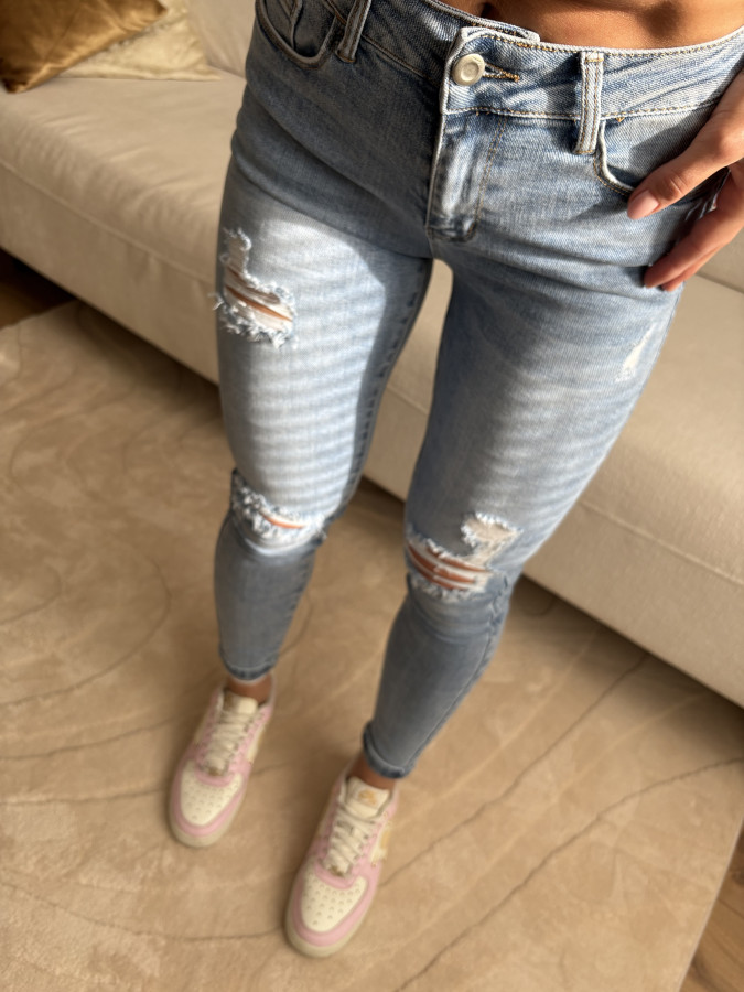 Elastické denim rifle z kvalitnej rifloviny . Sú s vyšším pásom. Na fotke je veľkosť S. Modelka má výšku 170cm.